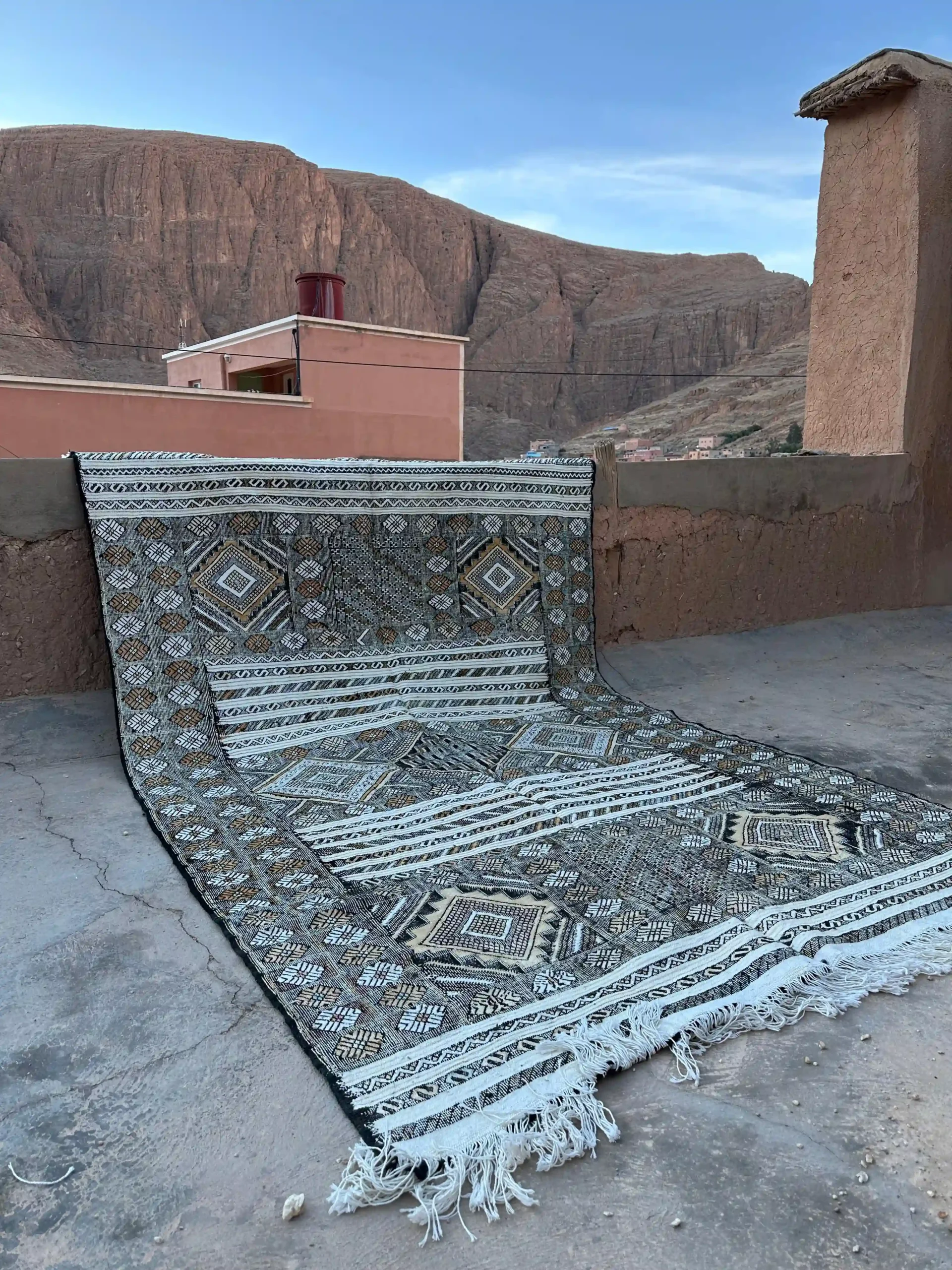 Authentic Berber Kilim rug, handcrafted by a Berber family using traditional Moroccan craftsmanship. Made from 100% natural wool and cactus silk, this rug is featherweight and easy to move, making it ideal for large living spaces and flexible interior arrangements.
