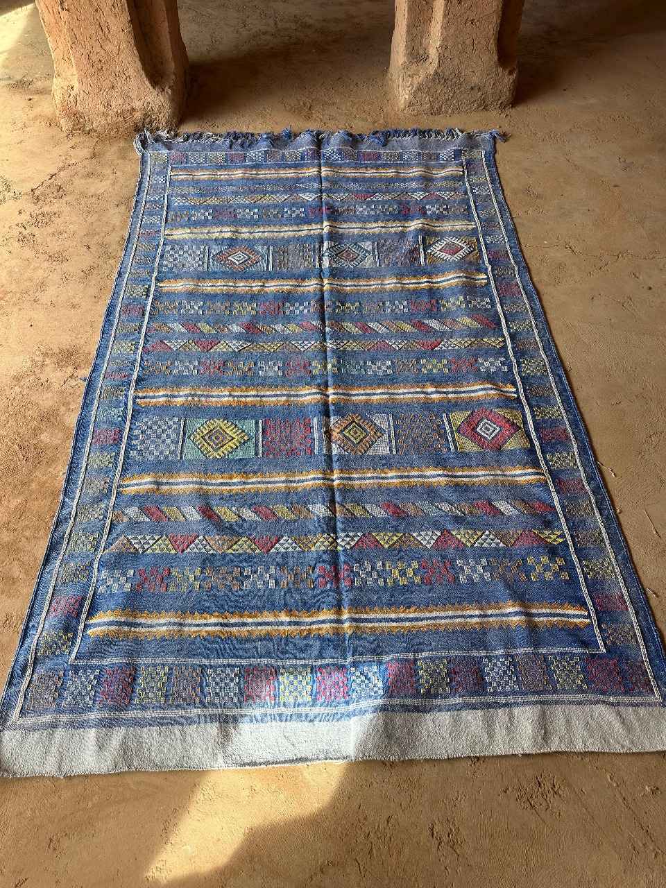 This beautiful blue indigo rug is richly embroidered with Berber symbols arranged in perfect harmony. These motifs create an abstract design, making it a bold statement piece for any bohemian interior. It can be used as a statement rug or ethnic wall hanging to bring a pop of color into your living room.