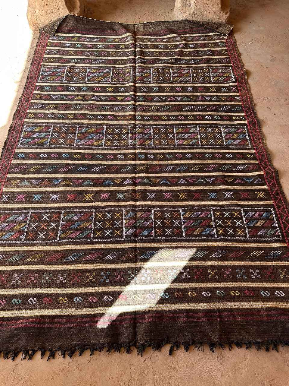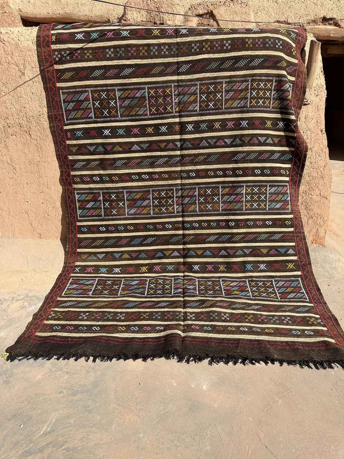 This beautiful nut brown Berber silk rug is richly embroidered with traditional Berber symbols, arranged in perfect harmony to create a striking abstract design. A true statement piece, it adds a bohemian touch to any interior and can be used as a luxurious floor rug or an ethnic wall hanging, bringing a vibrant pop of color to your living space.