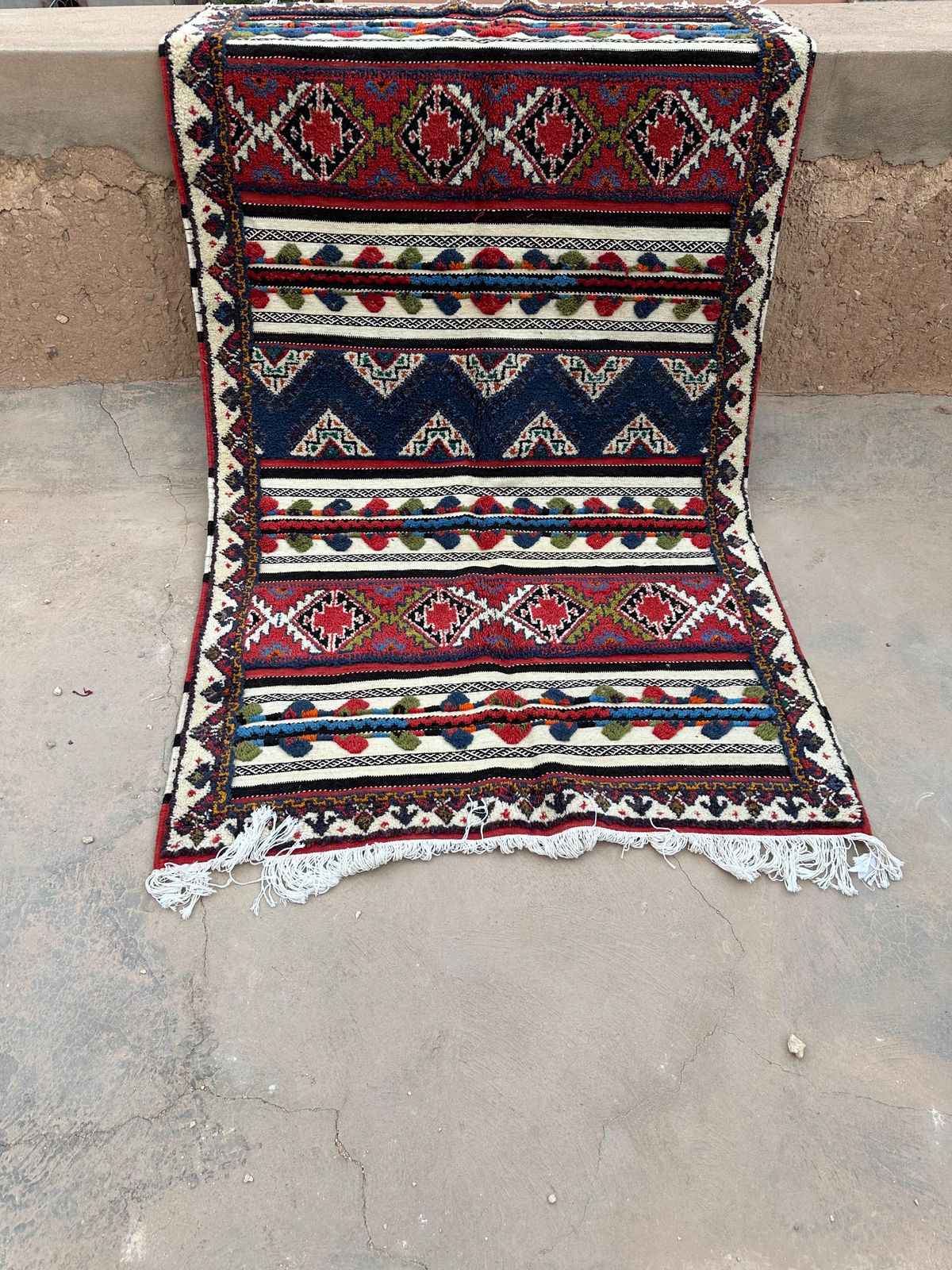 Filled with Amazigh symbols and letters, the rug is a true work of art, showcasing the full range of Berber weaving traditions, including weaving, knotting, and embroidery. The natural wool is carefully prepared, with threads stretched, doubled, and knotted by skilled artisans to ensure longevity and authenticity.