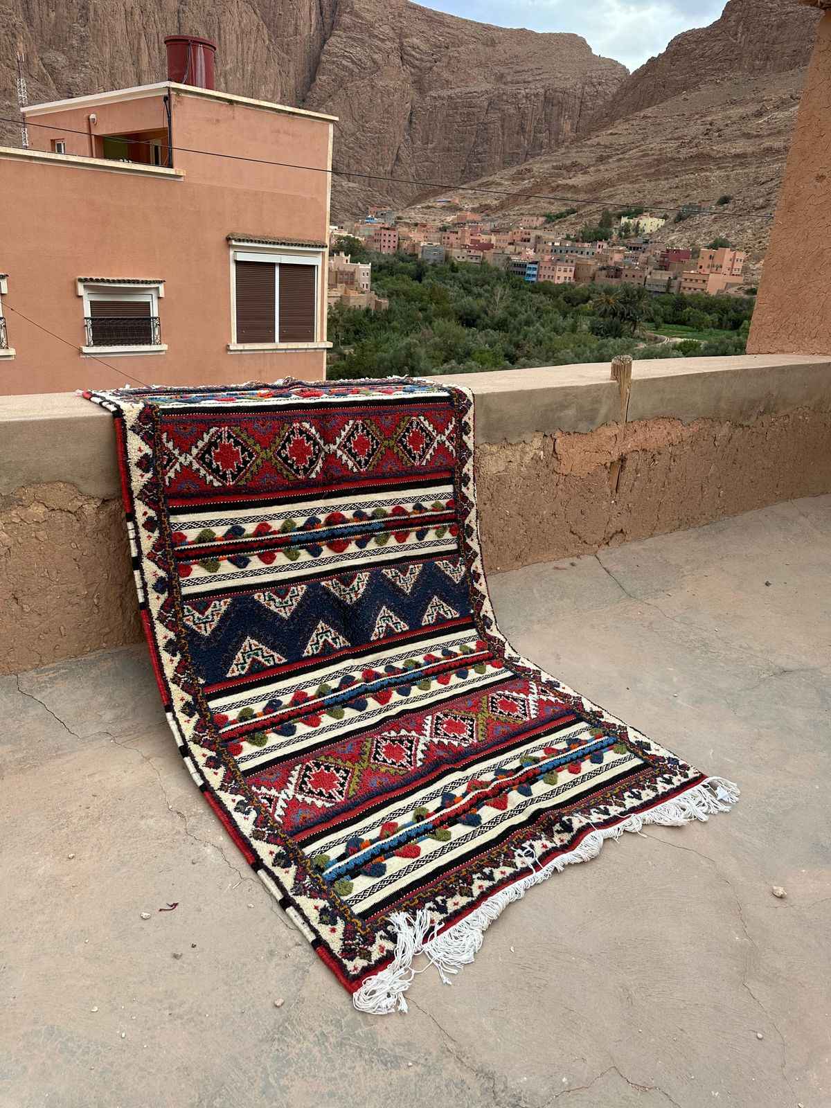 The Glaoui carpet is a remarkable piece of Moroccan heritage, historically linked to the kings of southern Morocco in the High Atlas. This handmade rug uniquely combines three textile techniques—knotted points, tapestry, and flat weaving—creating a double-sided masterpiece that is both durable and visually striking.