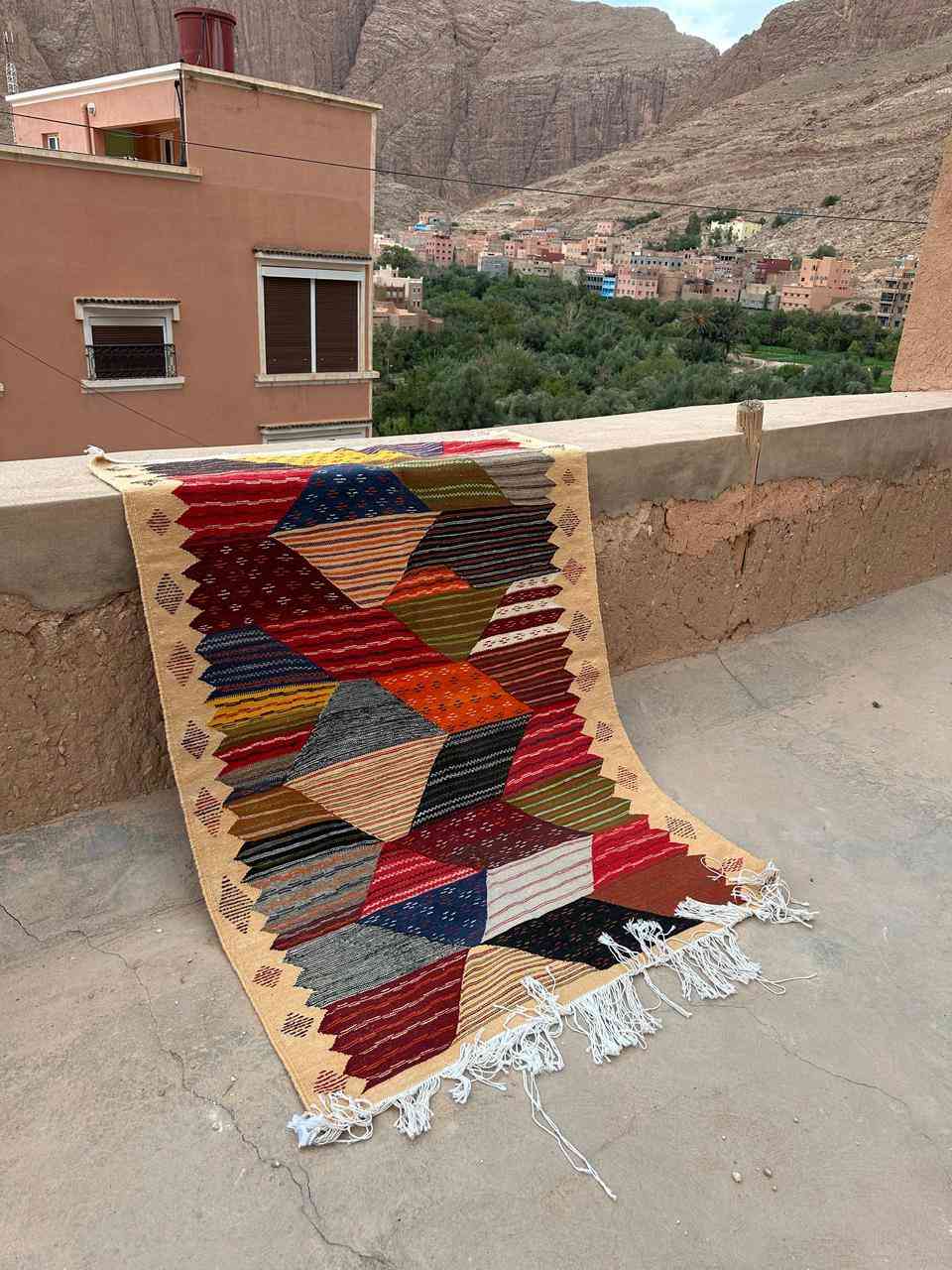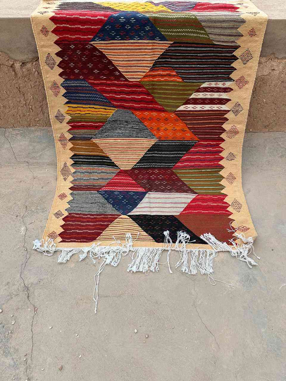 The Kharita rug from the Akhnif tribe is a handwoven, flat-weave masterpiece from the Taznakht region of Morocco, known for its intricate geometric patterns that often resemble maps. Crafted from 100% natural sheep’s wool or dromedary wool, this rug is durable, soft, and authentic.