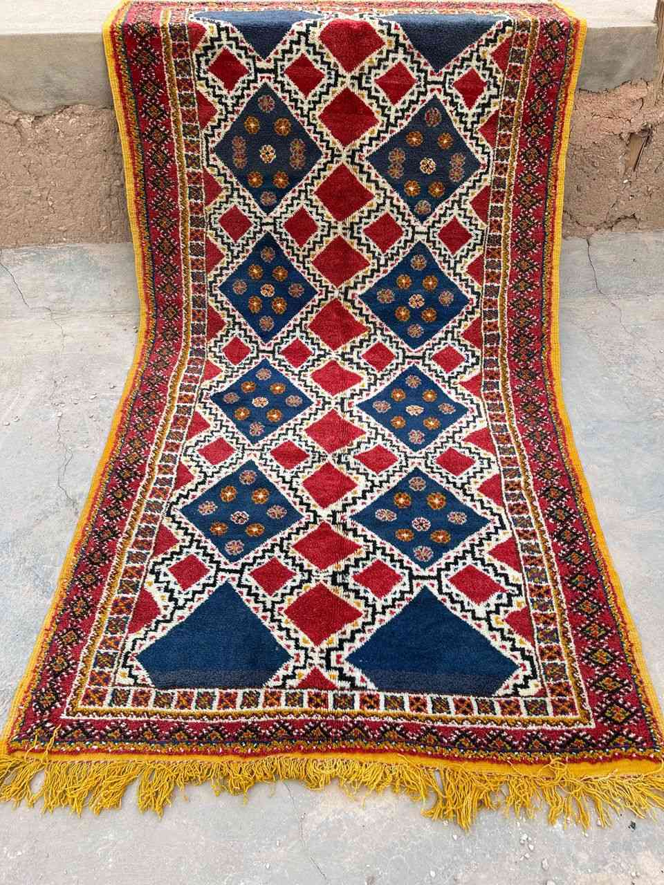 This Taznakht rug is handwoven from 100% natural sheep’s wool, representing high-quality Berber craftsmanship. It features geometric patterns in bright, natural colors, created using natural dyes such as poppy flowers, indigo, and saffron blended with cobalt mineral. Each rug tells a story of ancestral traditions, preserving the rich heritage of Moroccan weaving.