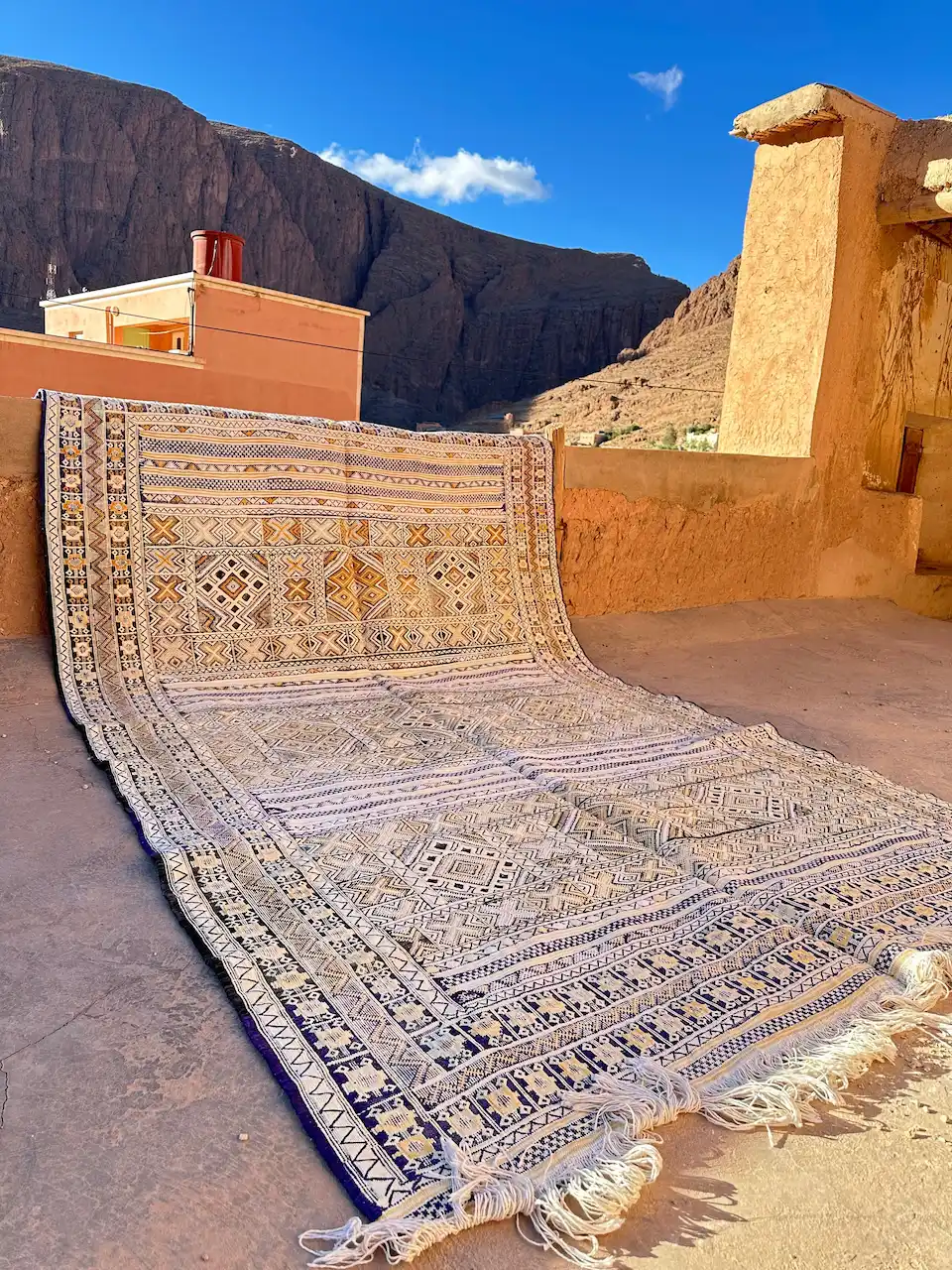 Kilim Rug a rare handmade Berber masterpiece, crafted over more than a year using natural sheep’s wool and cactus silk. Featherlight and easy to move, this flat-weave Kilim is ideal for warm climates and large living spaces. Its thin structure makes it pet-friendly, while the weaving loom and needle-embroidery techniques give it exceptional artistic detail.