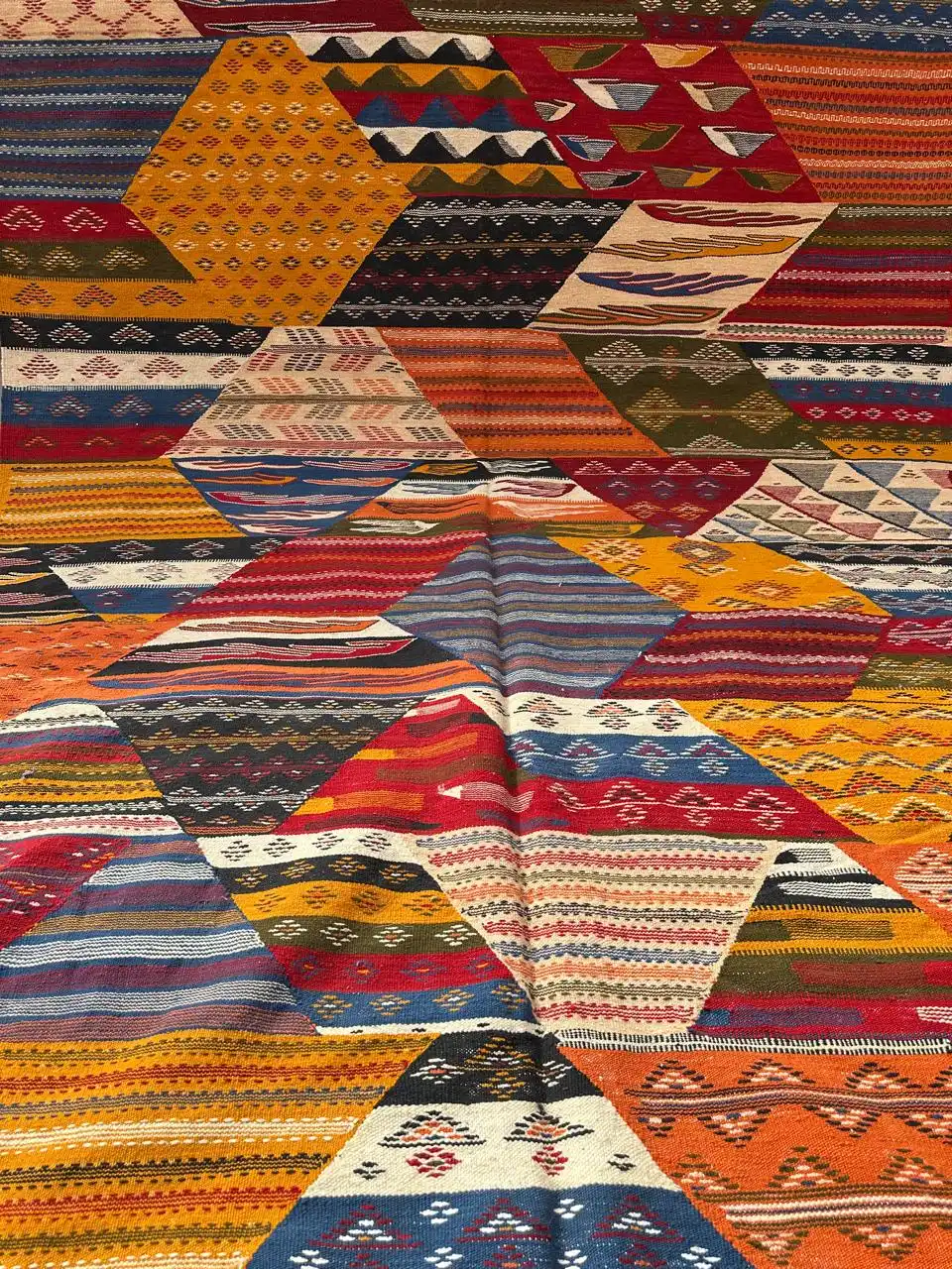 Woven from natural sheep’s wool and dromedary wool, and traditionally dyed with henna, saffron, poppy flowers, and indigo, this rug combines durability, cultural identity, and artistic expression. Its flat double-sided construction often makes it fully reversible.